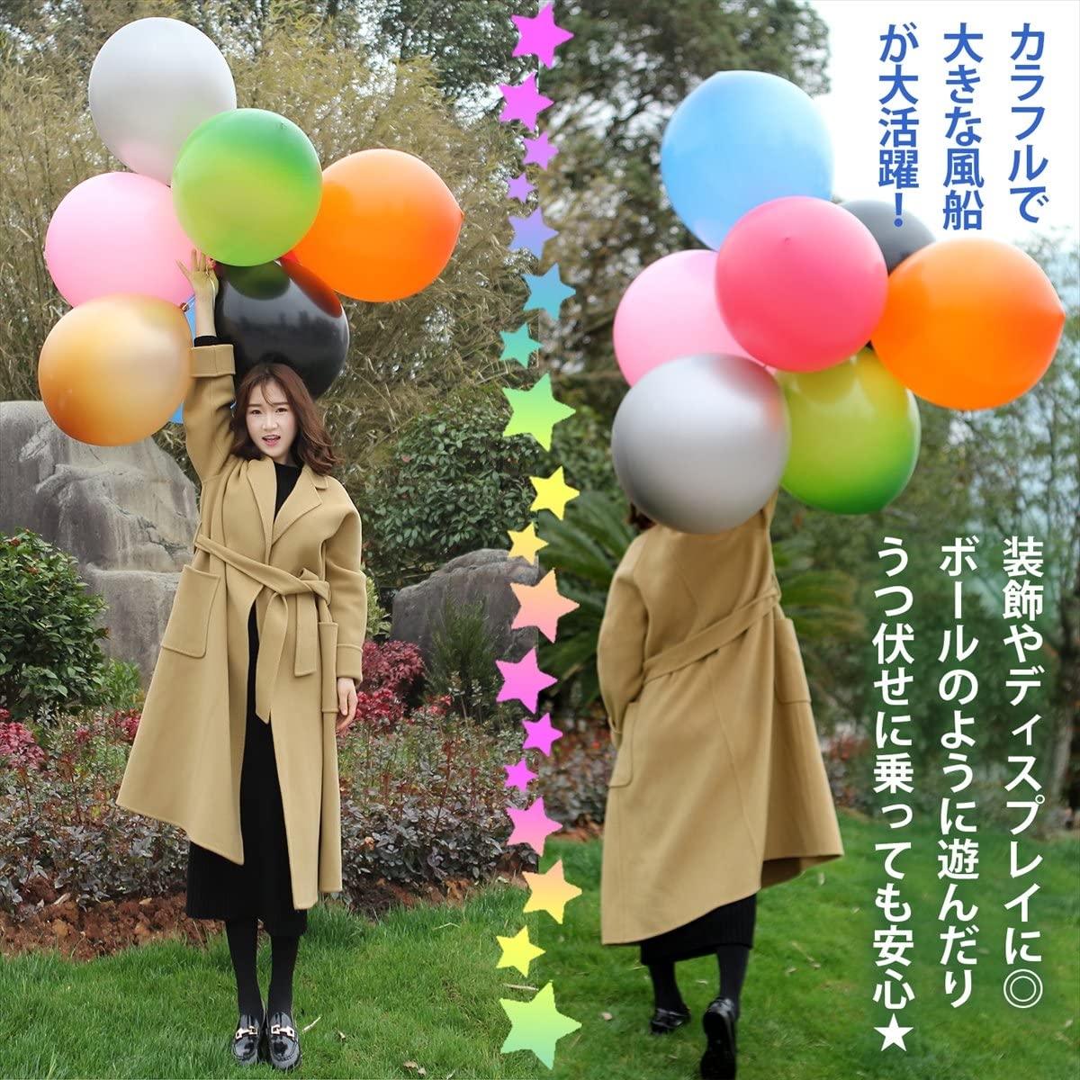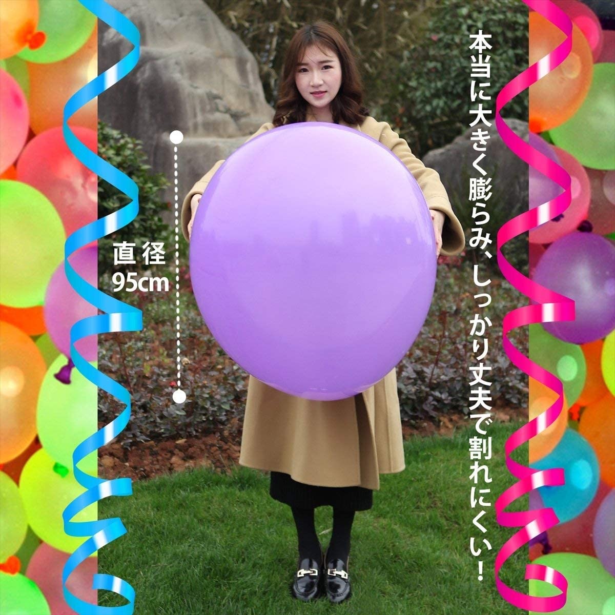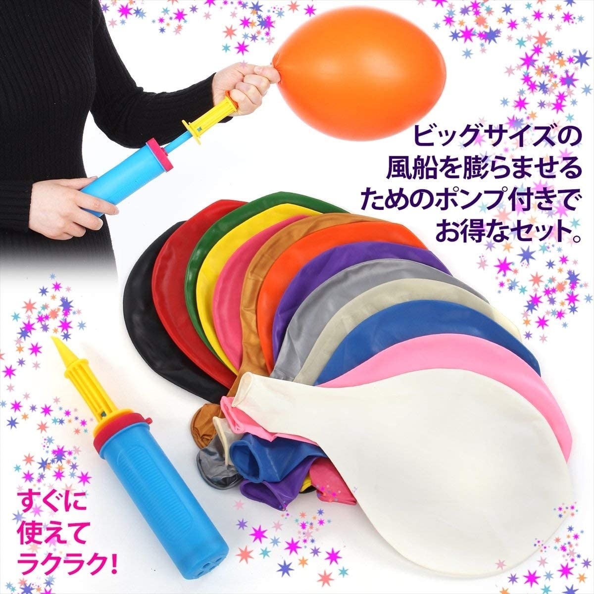 - 超特大の風船13色セット♪ 圧倒的大きさで、イベント時に大活躍します! 膨らませるためのポンプも付属しているお得なセットです!
